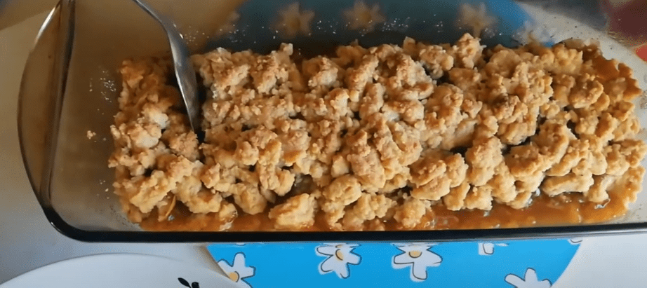 - spread the crumbs/ crumble over the sugar coated apples in the loaf pan