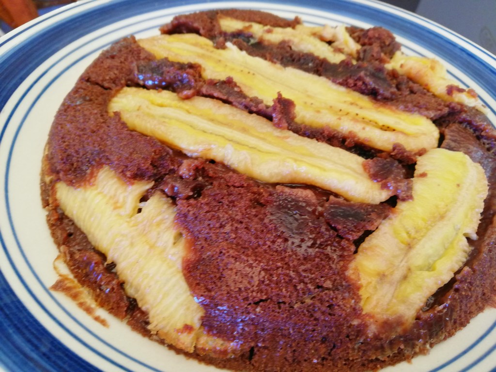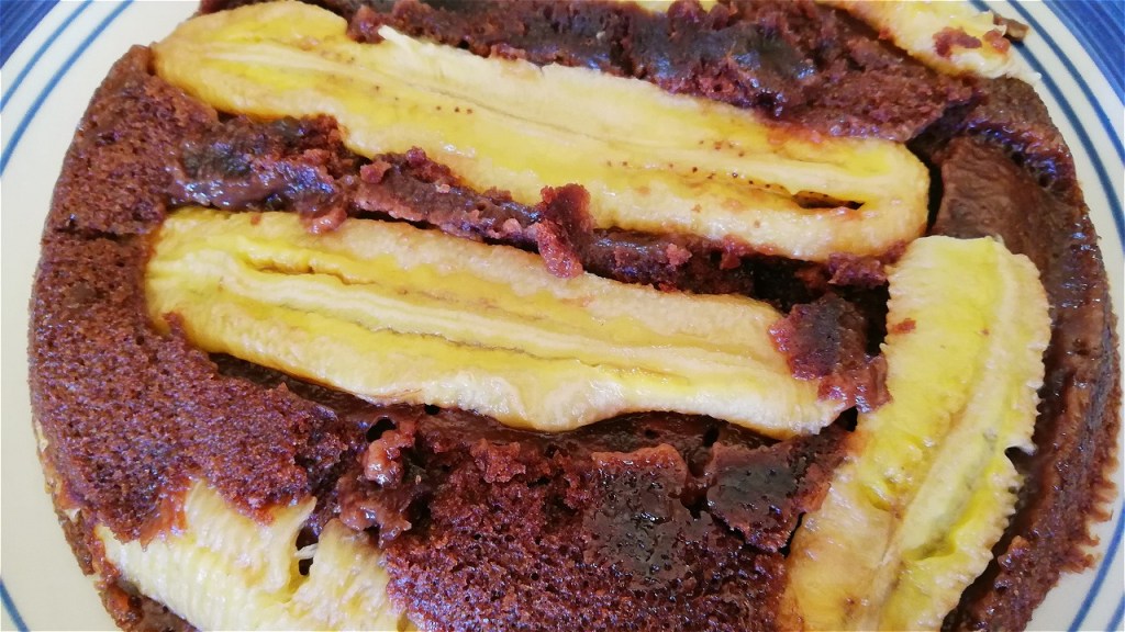- When done, take out of the oven, place a big plate on top and flip the cake over.
