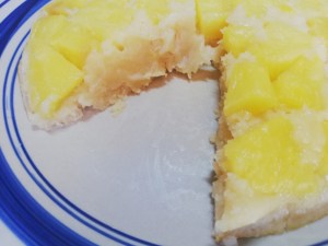 - Slowly add the cake mixture on top preventing the pineapple pieces to separate.