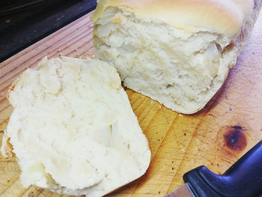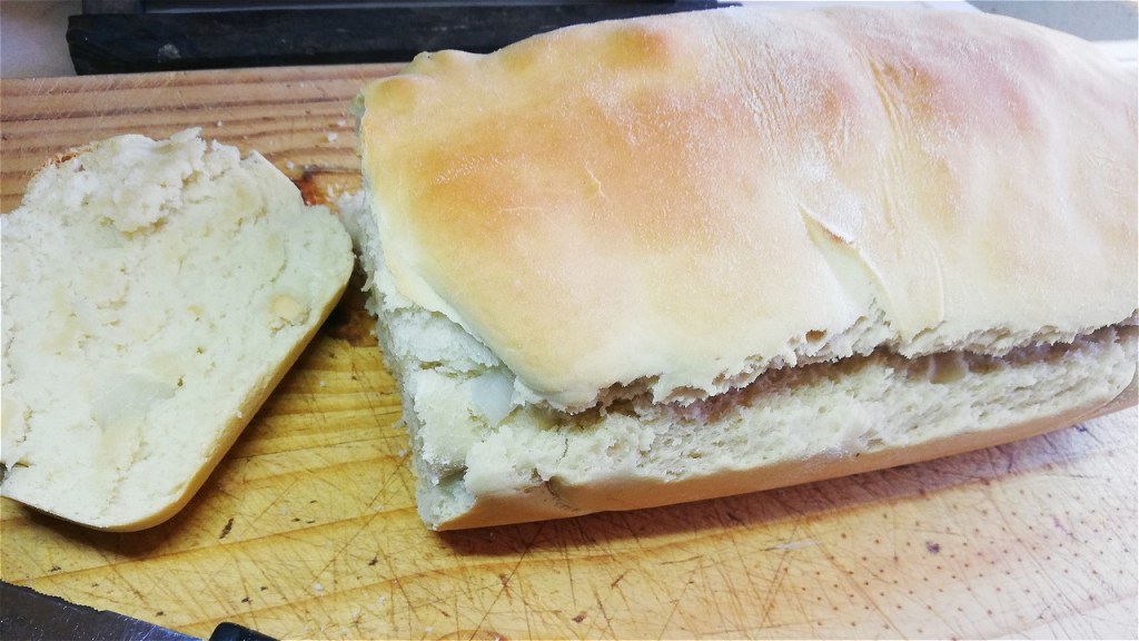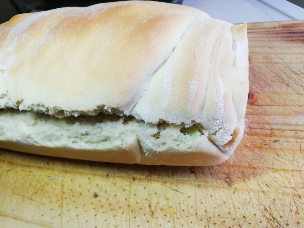 - Roll the dough up and put in a sprayed bread loaf pan.