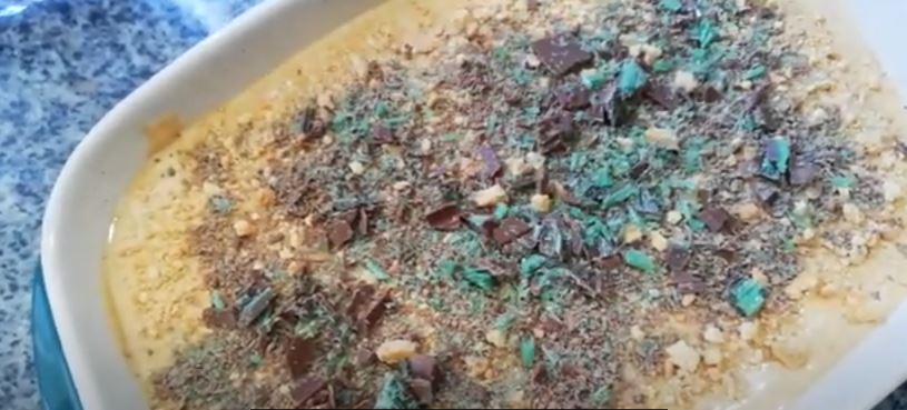 - -to garnish, sprinkle the cookie crumbs on top followed by the grated chocolate and adding the rough pieces on top.